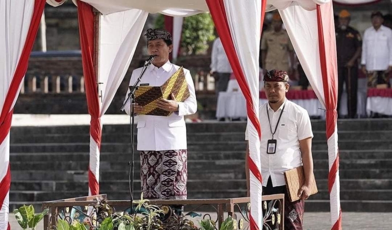 balitribune.co.id | Denpasar - Wali Kota Denpasar Jaya Negara mengukuhkan Pasukan Pengibar Bendera Pusaka (Paskibraka) Kota Denpasar pada Peringatan HUT Proklamasi Kemerdekaan ke-78 Republik Indonesia di halaman depan Gedung Dharma Negara Alaya Denpasar, Senin (14/8).