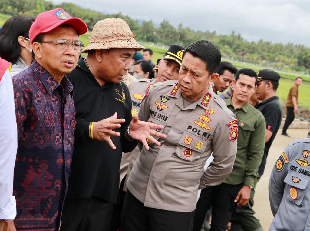 balitribune.co.id | Negara - Gubernur Bali, Wayan Koster bersama Kapolda Bali, Irjen Pol Putu Jayan Danu Putra dan didampingi Bupati Jembrana, Nengah Tamba meninjau langsung lokasi bencana banjir di Jembatan Bilukpoh serta Posko Penampungan Warga Terdampak Banjir di Kelurahan Tegalcangkring dan di Desa Penyaringan, Kecamatan Mendoyo, Kabupaten Jemb