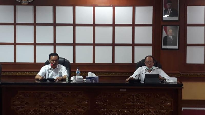 Bali Tribune / Ketua Satgas Penanggulangan Covid-19, Dewa Made Indra (kanan) mempimpin rapat penanggulangan covid-19 di Ruang Rapat Inspektorat Provinsi Bali, dihadiri OPD terkait.