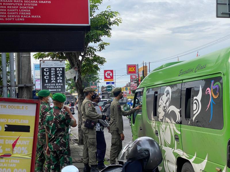 Bali Tribune/ Tim Yustisi melakukan penertiban protokol kesehatan di Simpang Jalan Ayani - Jalan Ken Arok Kelurahan Peguyangan Kecamatan Denpasar Utara, Selasa (21/12).