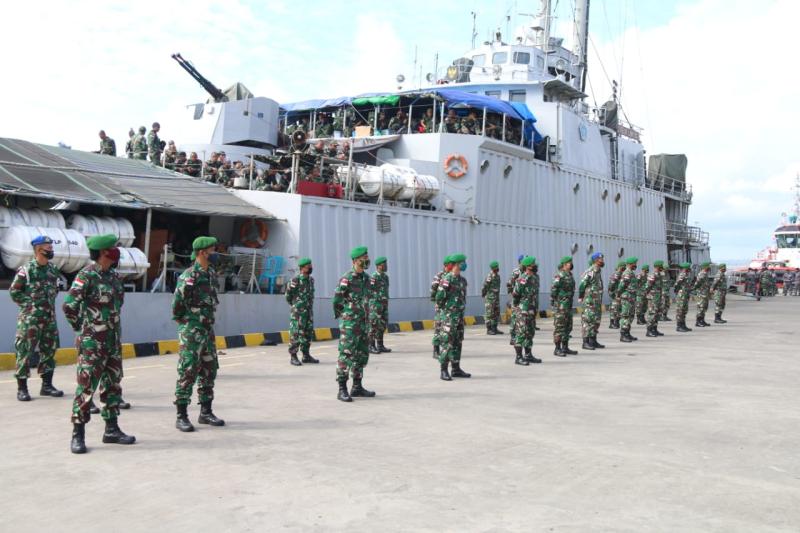 Bali Tribune/ Sebanyak 32 prajurit Kodam IX/Udayana yang tergabung dalam Satgas Intelijen dan Satgas Bantuan tiba di Dermaga Timur Pelabuhan Benoa, Denpasar, dengan menggunakan KRI Teluk Lampung-540, Kamis (13/8).