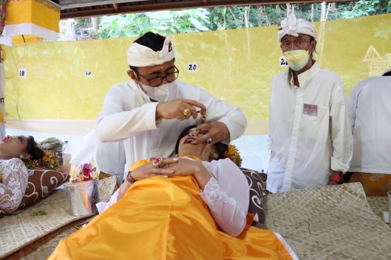 balitribune.co.id | Denpasar -  Wali Kota Denpasar I Gusti Ngurah Jaya Negara "Ngayah" Nyangging rangkaian Upacara Atma Wedana Desa Adat Kesiman Kecamatan Denpasar Timur, Sabtu (20/8) di Pura Dalem Mutering Jagat Kesiman. Prosesi mepandes atau potong gigi diikuti 609 orang yang sudah sejak pagi mengikuti satu persatu rangkaian upacara.