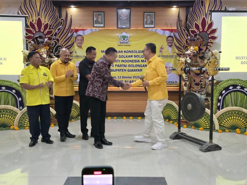 balitribune.co.id | Gianyar - DPD Partai Golkar Gianyar kini sah memiliki nakhoda baru. I Gede Sudarta terpilih secara aklamasi dalam Musda XI DPD Partai Golkar Gianyar, Senin (13/10/2025). Menariknya, Partai Golkar Gianyar kini mencoba bangkit dengan masuknya Tokoh Muda Puri Ubud dan aktifnya kembali Palingsir Puri Ubud.