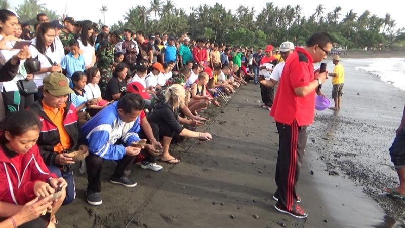 Bali Tribune/ LEPAS TUKIK – Acara pelepasan tukik serangakian aksi bersih pantai di Hari Strategi Konservasi se-Dunia.