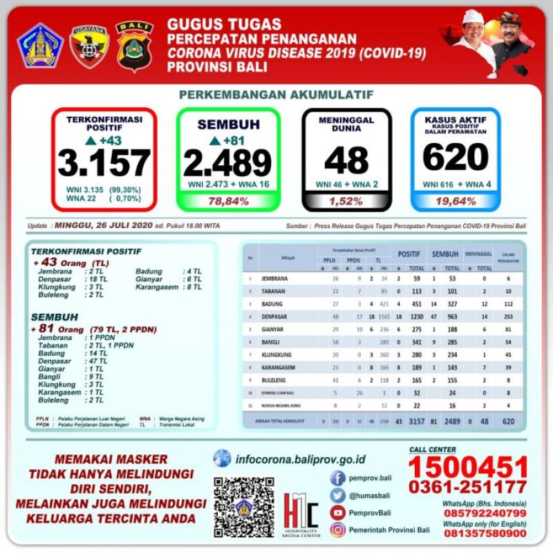 Balitribune.co.id | Denpasar - Gugus Tugas Percepatan Penanganan (GTPP) Covid-19 Provinsi Bali menyampaikan perkembangan per hari Minggu (26/7). Jumlah kumulatif pasien positif 3.157 (bertambah 43 transmisi lokal).