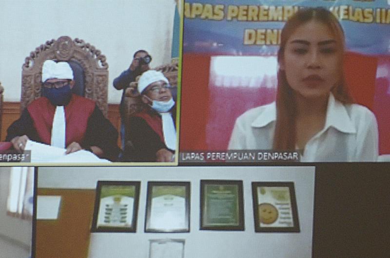 Bali Tribune/Terdakwa Shinta Sari Sadikno menjalani sidang dari Lapas Kerobokan melalui teleconference.