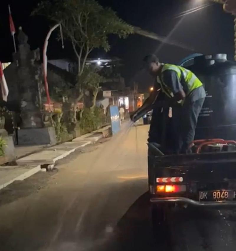 Site Manager PT Sanur Jaya Utama Putu Cahyadi mengatakan pengerjaan proyek rehabilitasi saluran drainase dan trotoar dimulai sejak 19 Mei 2023. Dalam proses pengambilan pekerjaan dilakukan pengerukan. Nah untuk meminimalisir debu yang bersumber dari tanah bekas galian saluran drainase itu berterbangan, maka telah dilakukan upaya penyemprotan dengan menggunakan air.