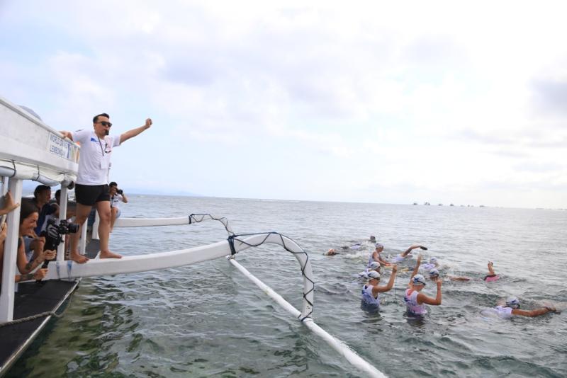 Head of Corporate Communications PT Astra International Tbk, Boy Kelana Soebroto (kiri) meniup peluit sebagai tanda dimulainya Bali Hope Swimrun 2018.