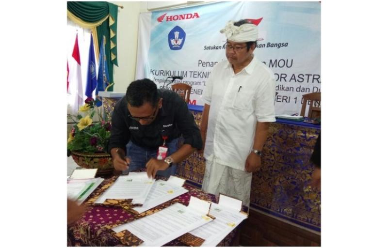 BALI TRIBUNE - PT Astra Honda Motor (AHM) bersama main dealer Astra Motor Bali, mengadakan perjanjian kerjasama, Memorandum of Understanding (MoU) program kurikulum Teknik Sepeda Motor (KTSM) Astra Honda dengan SMKN 1 Denpasar.