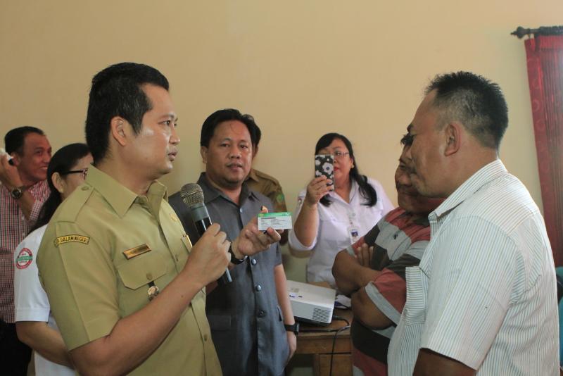 SERAHKAN - Wabup Kembang menyerahkan KIS kepada warga Jembrana yang belum memiliki JKN-KIS.