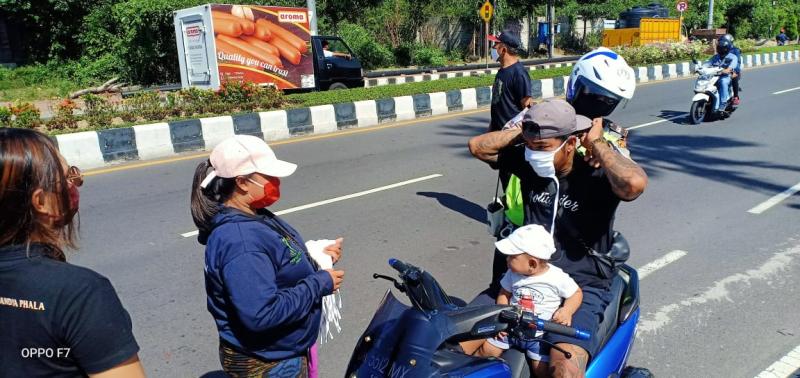 Bali Tribune/ Pembagian masker di Jalan By Pas Ngurah Ray, Sabtu lalu