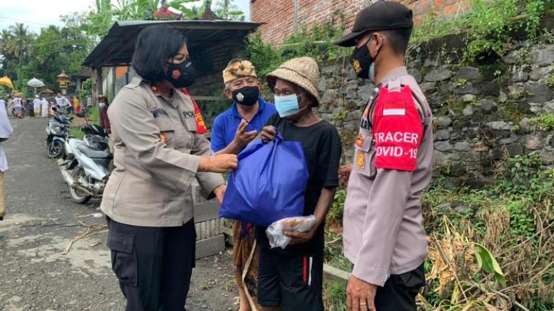 Bali Tribune/SEMBAKO - Wakapolres Kompol Luh Ketut Amy Ramayathi Prakasa,S.I.P bagikan sembako kepada lansia.