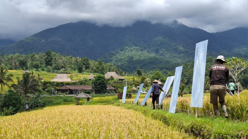 balitribune.co.id | Tabanan - Pemilik bangunan di kawasan objek wisata Jatiluwih yang ditutup pemerintah daerah memasang belasan pelat seng di pematang sawah mereka pada Kamis (4/12).