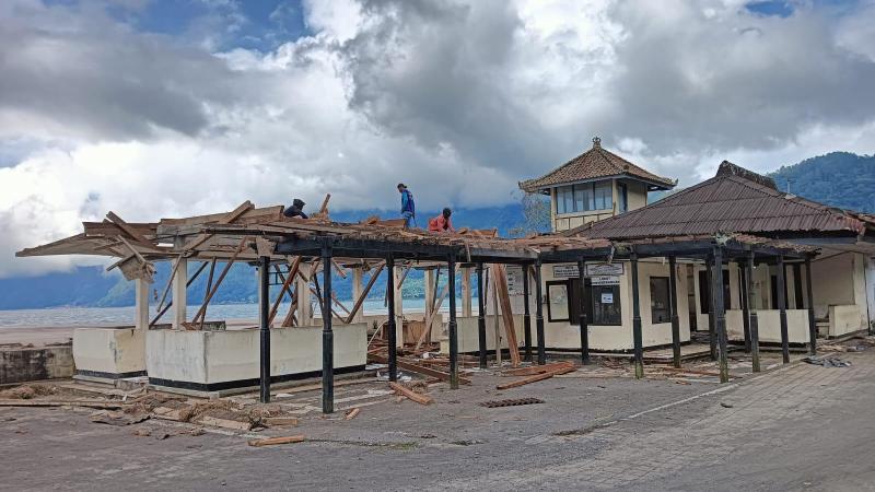 Bali Tribune/ PEMBONGKARAN – Proses pembongkaran bangunan utama Dermaga Kedisan, Kintamani.