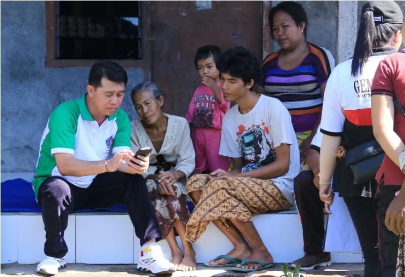 Bali Tribune/ Bupati Suwirta bercengkerama dengan warga setempat saat meninjau pelaksanaan program Bedah Desa di Desa Negari Kecamatan Banjarangkan,Klungkung, Sabtu (16/2) akhir pekan kemarin.