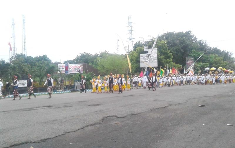 Serangkaian perayaaan Hari Raya Nyepi Caka 1940 dilangsungkan prosesi melasti yakni ritual pembersihan benda-benda sacral. Tampak iring-iringan warga di Kabupaten Jembrana saat dilangsungkannya ritual dimaksud, Rabu (14/3) sore kemarin.