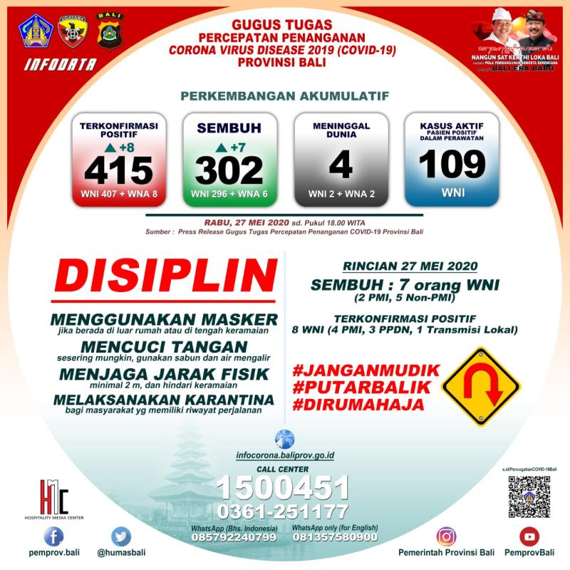 Ia menyebutkan, dengan adanya kasus baru tersebut, secara akumulatif pasien positif Covid-19 di Bali sebanyak 415 orang. Dari jumlah yang terinfeksi, saat ini yang dilaporkan telah sembuh sebanyak  302 orang. "Jadi hari ini (Rabu 27 Mei 2020) yang sembuh bertambah 7 orang WNI terdiri dari 2 orang PMI dan 5 orang transmisi lokal," sebut Dewa Indra.
