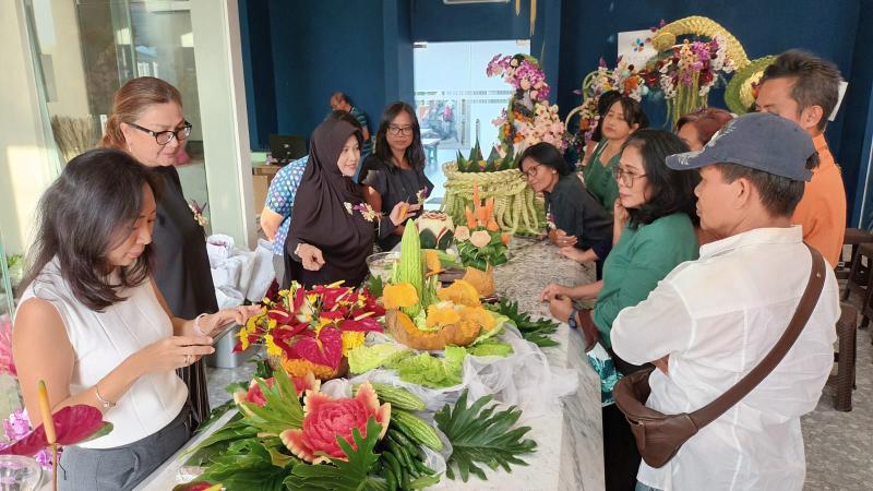 "Saya undang teman-teman Ikatan Perangkai Bunga untuk mendemokan skill mereka. Di sini ada merangkai bunga yang dikombinasi dengan cutting buah sama ulatan janur. Tidak menutup kemungkinan nanti kalau ada yang minat belajar merangkai bunga, silakan. Khusus cutting buah juga silakan, sama ulatan janur," katanya.