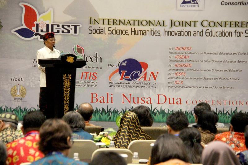 BALI TRIBUNE - Pembangunan secara berkesinambungan di berbagai aspek kehidupan semakin digalakkan seiring dengan perkembangan teknologi dan informasi era 4.0. Oleh karena itu diperlukan berbagai inovasi yang mampu menjadi alternatif pemecahan beragam permasalahan sosial dari disiplin ilmu terkait, baik Bidang sains maupun sosial. Sehingga pembangunan berkelanjutan perlu mendapatkan perhatian lebih dengan menghadirkan penelitian terkini berbasis pembangunan masyarakat dari akademisi sehingga masyarakat dapat memanfaatkan secara optimal. Hal ini dikatakan Gubernur Bali Wayan Koster dalam sambutannya saat membuka secara resmi International Joint Conference On Science and Technology (IJCST) di Bali Nusa Dua Convention Center, Badung, Kamis (18/10). Pada kesempatan tersebut, Gubernur Koster menyampaikan selamat datang kepada para peserta yang datang dari berbagai negara. Menurut Koster, merupakan suatu kehormatan bagi Pemerintah Daerah dan masyarakat Bali, karena Bali kembali dijadikan sebagai tempat konferensi bertaraf internasional. "Kehadiran Bapak/Ibu di Bali turut memberi kontribusi bagi pembangunan perekonomian di Bali," ucapnya. Lebih lanjut Koster mengatakan, Bali merupakan pulau kecil dengan luas wilayah 5.636,66 km2, terdiri dari 9 kabupaten/kota, 57 kecamatan, 716 desa/kelurahan, dan 1.493 desa adat, dengan jumlah penduduk 4,2 juta jiwa. Bali memiliki lebih dari 5.000 Pura sehingga dikenal sebagai pulau seribu Pura. "Karateristik yang lain, Bali dikenal sebagai pulau yang unik karena memiliki alam, manusia, dan budaya yang menyatu dalam satu kesatuan tatanan kehidupan, yang terus hidup di tengah-tengah masyarakat dalam dinamika perubahan global," ujarnya. Kedepan, dikatakan Koster pembangunan Bali akan fokus dengan memprioritaskan konservasi alam, manusia, dan budaya sesuai dengan visi Nangun Sat Kerthi Loka Bali, yang artinya menjaga kesucian dan keharmonisan alam Bali beserta isinya untuk mewujudkan kehidupan masyarakat Bali yang sejahtera dan bahagia secara sakala dan niskala. Oleh karena itu, orientasi, arah kebijakan dan program pembangunan Bali ke depan akan ditata kembali yang diselenggarakan secara terpola, menyeluruh, terencana, terarah, dan terintegrasi, dengan pendekatan dari hulu sampai ke hilir, dalam satu kesatuan wilayah Bali yang berpihak dan taat asas pada Genuine Bali. Untuk itu Gubernur Koster berharap, konferensi ini dapat menghasilkan berbagai rumusan dan konsep pembangunan berkelanjutan dan ramah lingkungan untuk mendukung pemberdayaan komunitas masyarakat. "Tentu saja, rumusan dan konsep pembangunan yang dihasilkan secara nyata akan dapat diimplementasikan oleh pemerintah termasuk pemerintah daerah dalam meningkatkan kualitas pembangunan demi kesejahteraan masyarakat yang berkeadilan. Oleh karena itu, sebagai Gubernur Bali sekaligus mewakili masyarakat Bali, Saya menyambut baik penyelenggaraan konferensi ini," pungkasnya. IJCST sendiri merupakan konferensi tahunan dengan penyelenggaraan berbasis konsorsium perguruan tinggi di Indonesia sejak tahun 2016. Konferensi ini merupakan platform internasional bagi ilmuwan, peneliti, praktisi, dan pemerintah untuk mendiskusikan penelitian dan praktik interdisipliner yang berfokus pada tema "Social, Science, Humanities and Education for Sustainable Development to Support Community Empowerment".