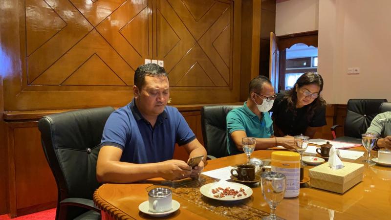 Bali Tribune / Bupati Gianyar Made Mahayastra saat persiapan video conference secara daring dengan sejumlah wartawan terkait wabah covid-19, Sabtu (28/3).
