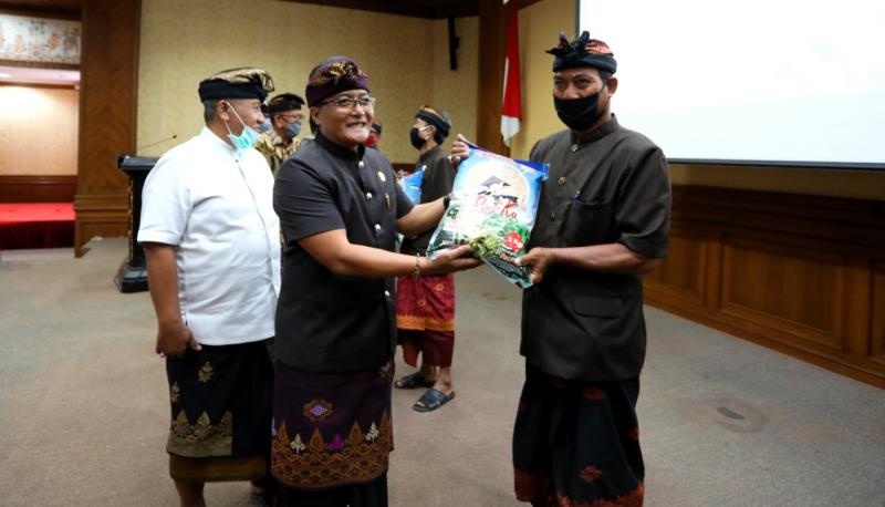 Bali Tribune / Bupati Giri Prasta saat menyerahkan Benih Padi Inbrida dan bibit sayur untuk subak se-Kabupaten Badung di Ruang Kerta Gosana Puspem Badung, Kamis (23/7).