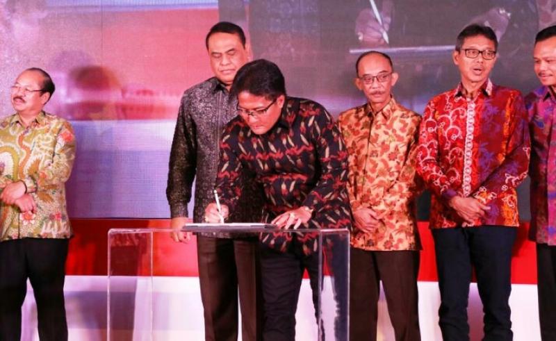 Bali Tribune/Bupati Badung I Nyoman Giri Prasta menandatangani komitmen sebagai daerah percontohan peningkatan kapasitas Sistem Pengelolaan Pengaduan Pelayanan Publik Nasional, Layanan Aspirasi dan Pengaduan Online Rakyat (SP4N-LAPOR!) di Jakarta, Selasa (24/9) lalu.