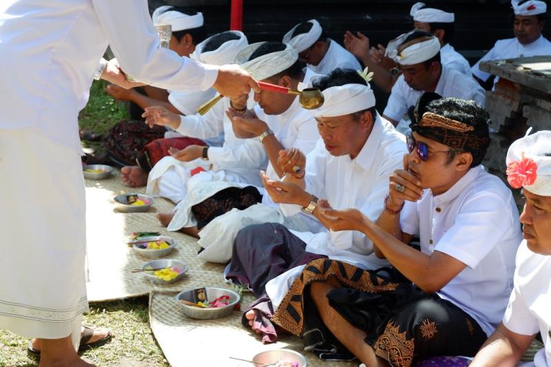 Bali Tribune/ PERSEMBAHYANGAN - Bupati Mahayastra persembahyangan karya Pedudusan lan Ngusaba Dalem di Pura Dalem Pekung Br. Payangandesa, Desa Melinggih Payangan.
