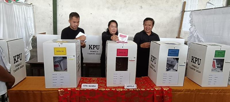 Balitribune.co.id | Bangli - Bupati Bangli Sang Nyoman Sedana Arta menggunakan hak pilih di kampung halaman di Banjar/Desa Sulahan, Kecamatan Susut, Kabupaten Bangli, Rabu (14/2/2024). Bupati Sedana Arta dan keluarga nyoblos di TPS 5 di GOR Desa Sulahan.