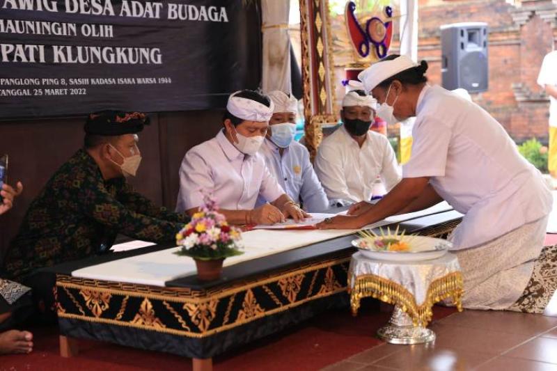 Hal tersebut menjadi arahan saat Bupati Klungkung, I Nyoman Suwirta Mengukuhkan Awig-Awig di Pura Puseh dan Bale Agung Desa Adat Budaga, Kecamatan Klungkung, Kabupaten Klungkung, Jumat (25/3). Turut hadir Ketua Majelis Desa Adat (MDA) Kabupaten Klungkung Dewa Made Tirta, Camat Klungkung Putu Arnawa serta tokoh desa setempat.