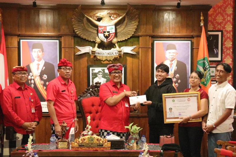 Bali Tribune / PENGHARGAAN - Bupati Sanjaya berikan apresiasi dan piagam penghargaan kepada Putra Tabanan, I Gede Agustin Anggara Putra alias Gustin (23), yang diserahkan secara langsung, Kamis, (18/1), di Ruang Rapat Bupati Tabanan.
