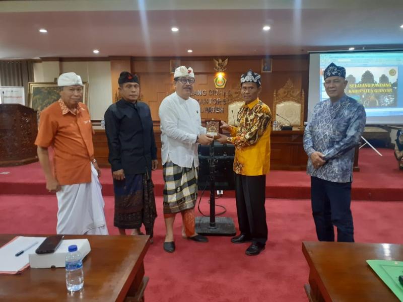 balitribune.co.id | Gianyar - Wakil Bupati Gianyar Anak Agung Gde Mayun didampingi Asisten Administrasi Pemerintahan dan Kesejahteraan Rakyat I Ketut Mudana dan Ketua PHDI Kabupaten Gianyar I Wayan Ardana menerima kunjungan studi tiru rombongan Bupati Kabupaten Tanah Laut, Provinsi Kalimantan Selatan H. Sukamta di Ruang Sidang Utama Kantor Bupati Gianyar, Selasa (25/10/2022).