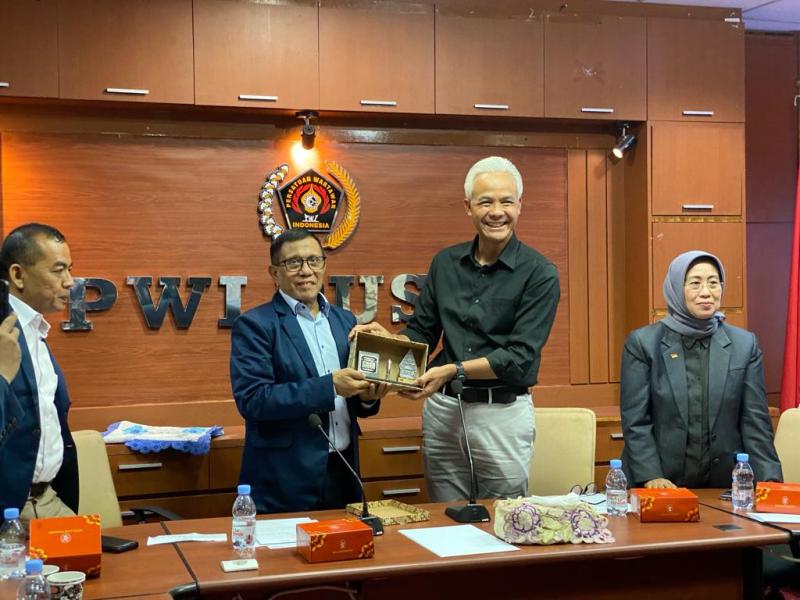 Bali Tribune / KUNJUNGI PWI - Capres Ganjar Pranowo menerima cenderamata dari Ketua Umum PWI Pusat Hendry Ch Bangun saat berkunjung ke PWI Pusat, Kamis (30/11)