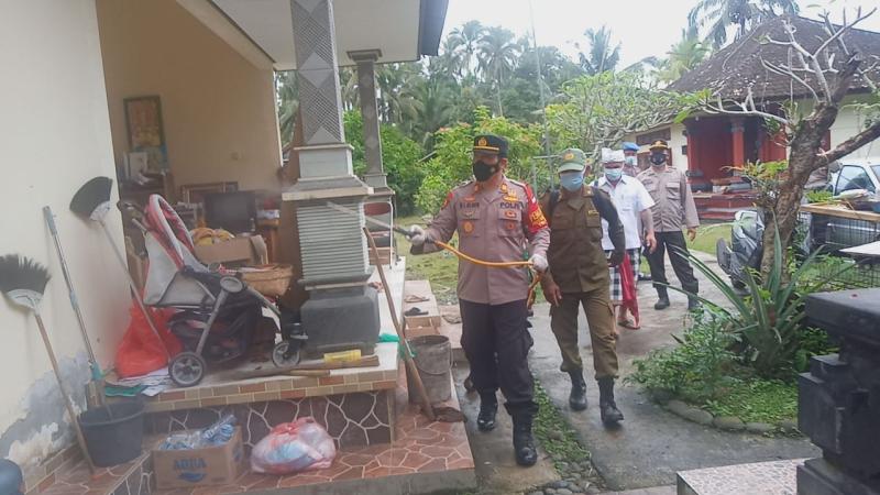 balitribune.co.id | Tabanan - Dalam upaya mencegah penyebaran covid-19 di wilayah Kecamatan Selemadeg Barat, Kabupaten Tabanan, Kapolsek Selbar AKP I Gusti Lanang Jelantik SH, bersama dengan aparat Desa yang tergabung dalam Satgas Tangguh Dewata Desa Mundeh, dan Bhabinkamtibmas Desa Mundeh, melakukan penyemprotan disinfektan pada rumah warga yang pernah terkonfirmasi positif covid-19.