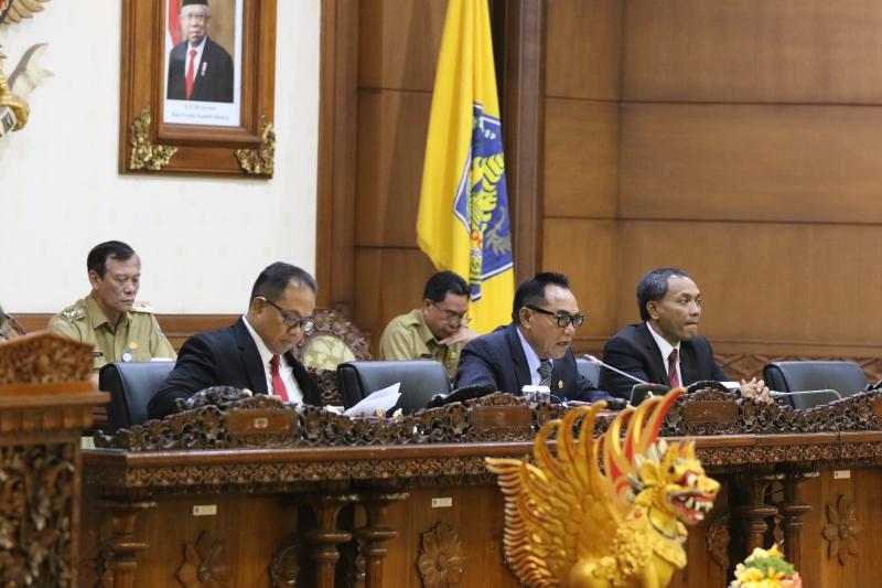 Saat Rapat Paripurna yang dipimpin Ketua DPRD Provinsi Bali, I Nyoman Adi Wiryatama dihadiri Penjabat (Pj.) Gubernur Bali, Sang Made Mahendra Jaya. Pada kesempatan itu, Pj. Gubernur Bali menyampaikan jawaban dan penjelasan atas pandangan umum seluruh Fraksi DPRD Provinsi Bali terhadap 2 Raperda, yaitu Raperda Provinsi Bali tentangPertanggungjawaban Pelaksanaan Anggaran Pendapatan dan Belanja Daerah (APBD) Semesta Berencana Provinsi Bali Tahun Anggaran 2023 danRaperda tentang Rencana Pembangunan Jangka Panjang Daerah Provinsi Bali Tahun 2025-2045.