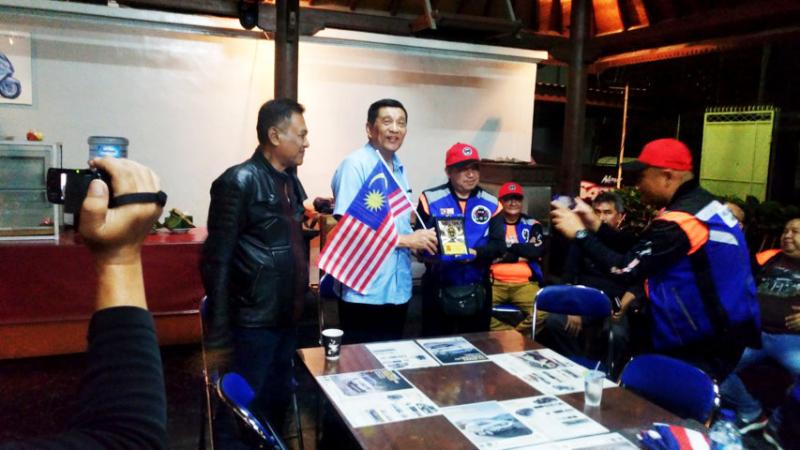 Dirut CSBI, Cahaya Wirawan Hadi, saat menerima cinderamata dari bikers Malaysia.
