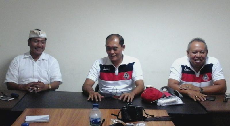 PENJELASAN – Ketum Asprov PSSI Bali, Ketut Suardana (kanan) saat menjelaskan terkait hujatan suporter Bali United terhadap PSSI Bali di media sosial. Tampak hadir Wakil Sekum PSSI Bali, Made Rai Ridartha (tengah) dan Exco PSSI Bali, IGAN Anom Jaksa.