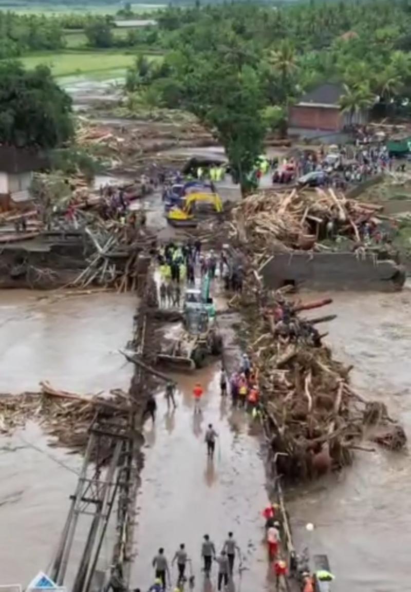 Bali Tribune / PEMBERSIHAN - Potongan video udara proses pembersihan material banjir di jembatan Tukad Bilukpoh yang menyebabkan arus lalu lintas Jawa-Bali macet total sejek Minggu malam.