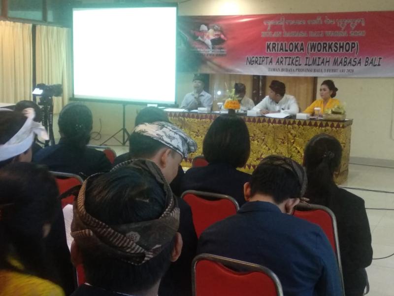 balitribune.co.id | Denpasar - Dinas Kebudayaan Provinsi Bali menggelar Kriyaloka  (workshop) Artikel Mabasa Bali, serangkaian Bulan Bahasa Bali 2020, di Ruang Cinema, Gedung Ksirarnawa, Taman Budaya Bali, Senin (3/2). Workshop digelar  guna menggaungkan penulisan artikel berbahasa Bali.