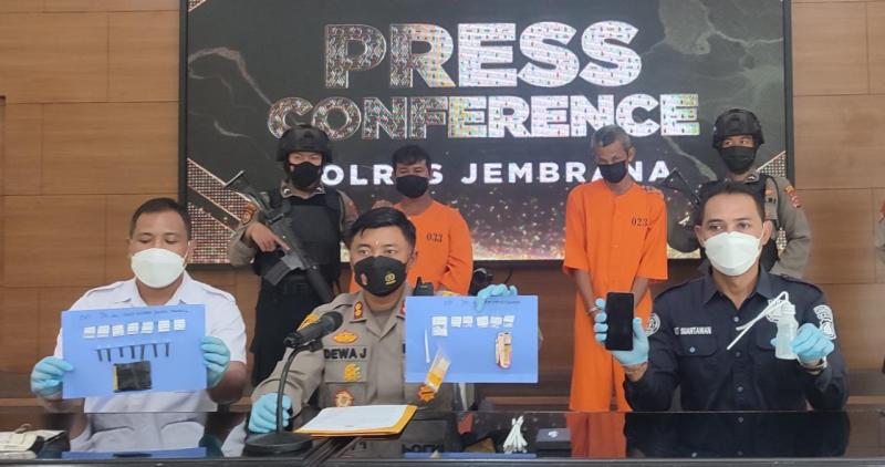 Bali Tribune/DIAMANKAN - Dua pelaku penyalahgunaan dan peredaran gelap narkoba diamankan di Polres Jembrana dengan sejumlah barang buktinya.