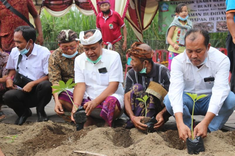 Bali Tribune/ TANAM - Bupati I Made Gianyar tanam bibit porang di lahan kelompok usaha bersama Bukit Sari, Selasa (21/10).