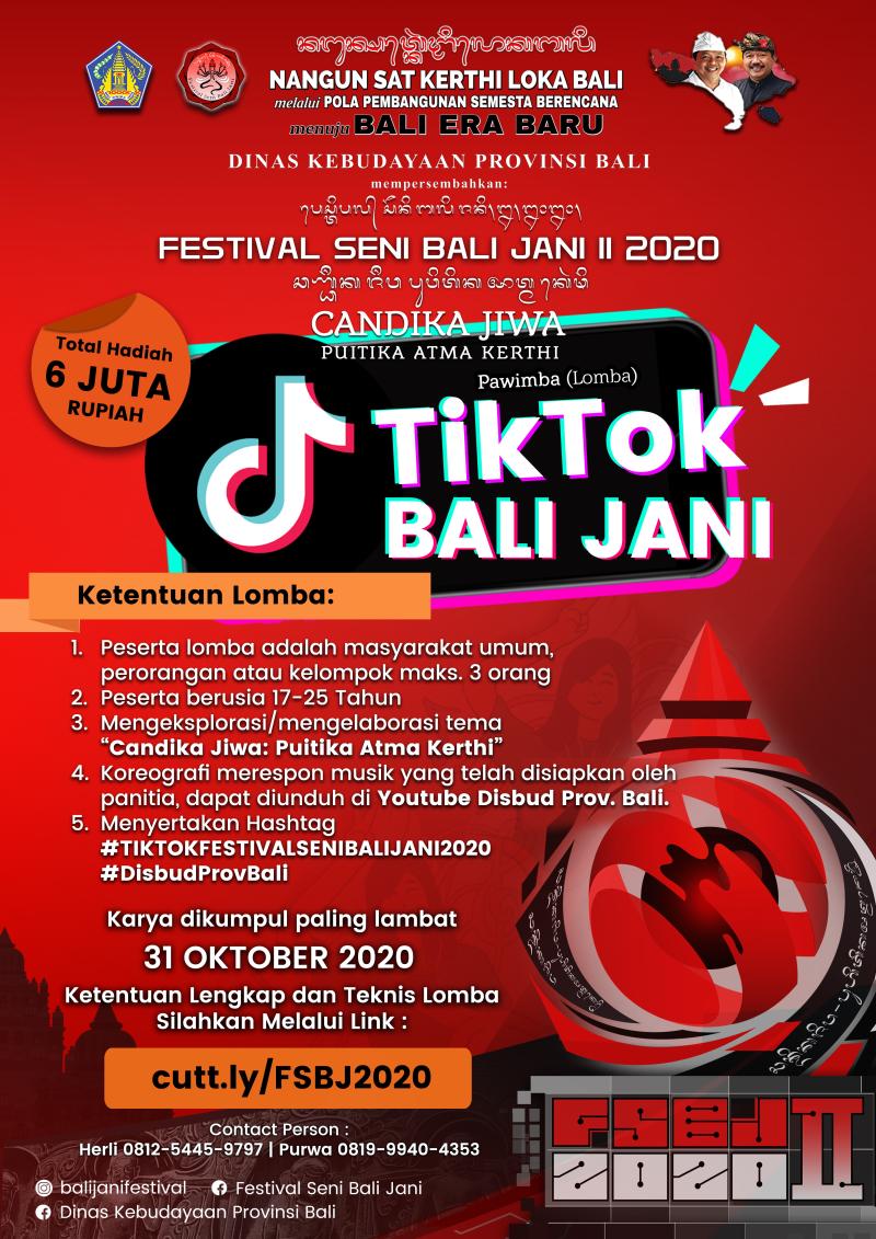 balitribune.co.id | Denpasar – Pemerintah Provinsi Bali melalui Dinas Kebudayaan Provinsi Bali tetap berkomitmen untuk menyelenggarakan Festival Seni Bali Jani (FSBJ) II guna tetap menjaga ‘roh' kesenian Bali beserta para seniman dan pekerja seni lintas bidang. Penyelenggaraan FSBJ tahun ini bertepatan pandemi Covid-19 yang akan berlangsung pada 31 Oktober-7 November 2020, disajikan secara virtual di kanal youtube Disbud Prov. Bali.