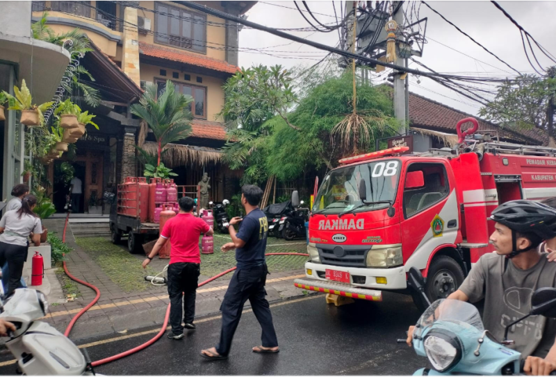 balitribune.co.id | Gianyar - Kepulan asap sempat meriuhkan aktivitas pariwisata di jalan Monkey forest, Ubud, Minggu (14/12) Pukul 10.00 Wita. Sebuah hotel dan Spa mengalami kebakaran yang dipicu kebocoran tabung gas. Seorang petugas dari distributor gas elpiji mengalami luka bakar saat mengganti tabung.