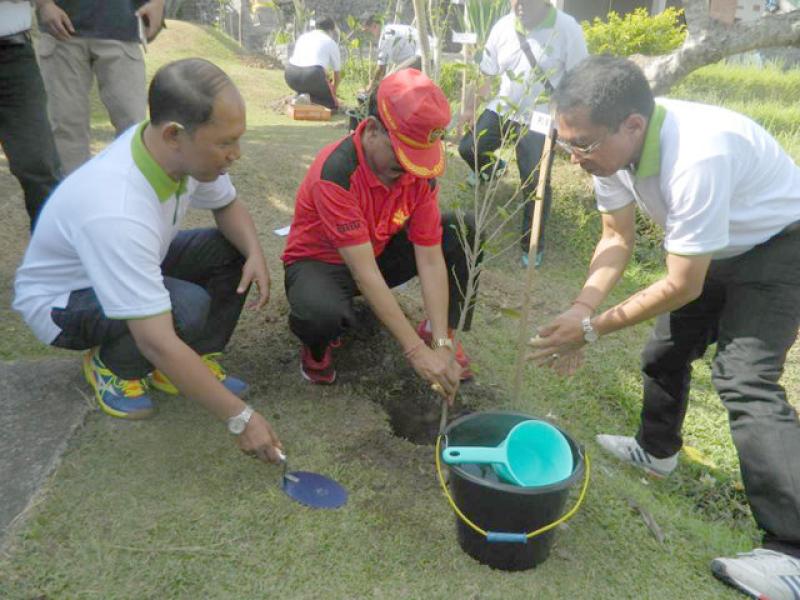 BALI TRIBUNE - Mewujudkan lingkungan yang hijau, asri, indah dan bermanfaat bagi masyarakat, PDAM se-Bali bersama warga Desa Sidan, Gianyar, melaksanakan penanaman ratusan pohon di kawasan Wisata Stage Sidan, Jumat (11/5). Kegiatan serangkaian Peringatan Hari Air Sedunia oleh PDAM se-Bali dan dipusatkan di Gianyar ini, 800 bibit pohon bunga ditanam dengan melibatkan warga setempat.