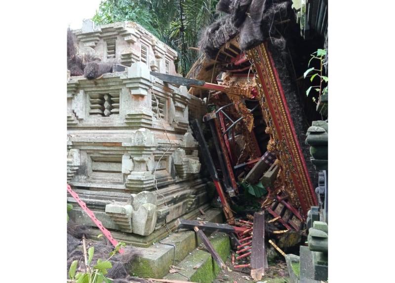 Balitribune.co.id | Gianyar - Seorang Pemangku Pura, yakni Jero Mangku I Wayan Weda serta Prajuru Adat nyaris jàdi korban pohon tumbang di Pura Alas Arum, Basangambu, Manukaya, Tampaksiring, Selasa (19/1). Saat kejadian, Jero Mangku sedang melaksanakan pemujaan (Nganteb Banten), tiba-tiba ranting pohon yang sangat besar roboh ke arah pura. Syukurnya, Jero Mangku luput dari timbunan pohon, namun dua bangunan pura mengalami rusak parah.