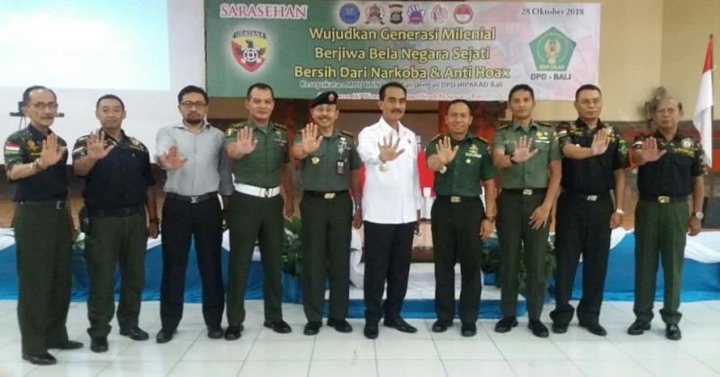 BALI TRIBUNE - Bersinergi dengan Badan Narkotika Nasional (BNN) Provinsi Bali, seluruh pengurus dan anggota Dewan Pengurus Daerah (DPD) Himpunan Putra-Putri Keluarga Angkatan Darat (Hipakad) Bali menyatakan siap memerangi segala jenis peredaran narkoba di Bali. Kerja sama tersebut dituangkan dalam bentuk penandatanganan naskah (MoU) di sela acara ”Sarasehan DPD Hipakad Bali” di Aula Makorem 163/Wira Satya, Denpasar, Minggu (28/10). “Bertepatan dengan Hari Sumpah Pemuda, sebagai anak bangsa sekaligus generasi milenial penerus perjuangan bangsa, kami ingin bangsa Indonesia bersih dari narkoba. Sebagai wujud bela negara, meski kami bukan anggota militer juga bukan tentara, tetapi dalam jiwa kami mengalir jiwa Sapta Marga orang tua kami,” tegas Ketua DPD Hipakad Bali, John Korasa Sonbai, SH., MH. Terkait maraknya berita dan informasi bohong (hoax), Hipakad Bali dengan tegas menyatakan anti-hoax. Hal ini sesuai dengan tema sarasehan, yaitu “Mewujudkan Generasi Milenial Berjiwa Bela Negara Sejati Bersih dari Narkoba dan Anti Hoax”. Pangdam IX/Udayana Mayjen TNI Benny Susianto, SIP., dalam amanatnya dibacakan Staf Ahli Bidang Operasi Militer Selain Perang (OMSP) Kolonel Arm I Made Sukarwa, berharap melalui kegiatan ini dapat membentuk generasi muda berjiwa bela negara sejati bersih dari narkoba dan anti-hoax. Diharapkan pula Hipakad Bali sebagai organisasi yang memiliki jiwa militan akan semakin menunjukkan eksistensinya dalam menjunjung tinggi nilai nasionalisme. “Sarasehan ini hendaknya menjadi sarana kebangkitan seluruh generasi muda Bali, khususnya putra-putri Hipakad Bali untuk meningkatkan kepedulian dan kebersamaan dalam mengatasi berbagai permasalahan, terutama dalam menanamkan dan mempertebal jiwa bela negara, memerangi narkoba, dan tidak percaya dengan berita bohong yang menyesatkan (hoax),” harap Pangdam.        Kepala BNN Provinsi Bali, Brigjen Pol Drs I Putu Gede Suastawa, SH., mengapresiasi niat dan semangat Hipakad Bali yang peduli untuk ikut memerangi peredaran narkoba di Bali. “Setelah menandatangani MoU ini, Hipakad Bali harus segera membuat “timeline” dan menyusun kegiatan, seperti sosialisasi dan edukasi kepada masyarakat tentang bahaya narkoba,” saran Brigjen Pol Putu Gede Suastawa. Turut hadir dalam acara tersebut, Kepala Perwakilan Kementerian Pertahanan Provinsi Bali Kolonel Inf Budiastawa, SSos, MSi., Letkol Inf Fredi Siboro (mewakili Danrem 163/Wira Satya), Kompol I Wayan Wesnawa Adiputra, SIK., MSi., (mewakili Kapolda Bali), Mayor Cpm Darsono (mewakili Danpomdam IX/Udayana), Dewan Pembina Hipakad Bali, sejumlah Ketua Ormas, dan tamu undangan terkait.
