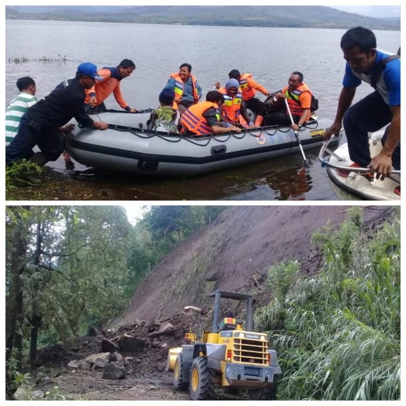 LEWAT DANAU - Tim gabungan membantu masyarakat menyeberang danau, pascalongsor yang menutup akses jalan Desa Buahan-Desa Trunyan, Kecamatan Kintamani. Insert: Tebing longsor menutup jalan.