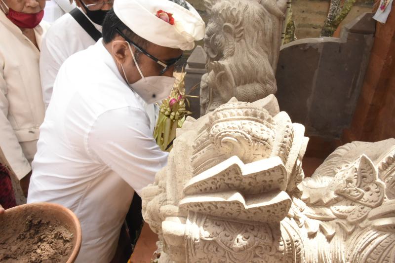 Bali Tribune/ Wakil walikota Denpasar IGN Jaya Negara mengikuti prosesi Mendem Pedagingan di Palinggih Sunia, Pura Maospahit Jl. Ratna, Tonja, Kecamatan Denpasar Utara, Kamis (13/8).