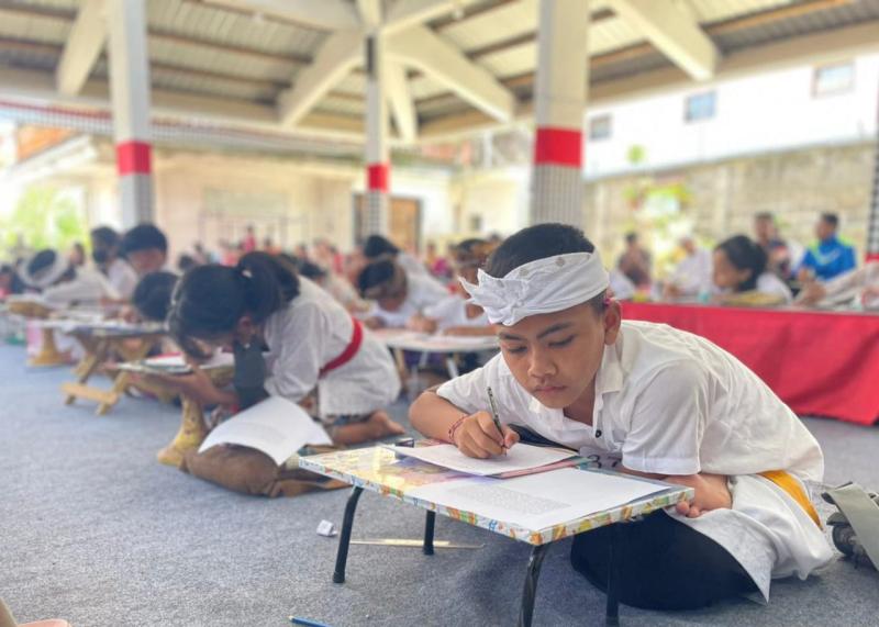 Bali Tribune / LOMBA - Nyurat Aksara Bali Bulan Bahasa Bali VI Tahun 2024 yang dilaksanakan di Balai Banjar Kawan, Bangli, Selasa (6/2).