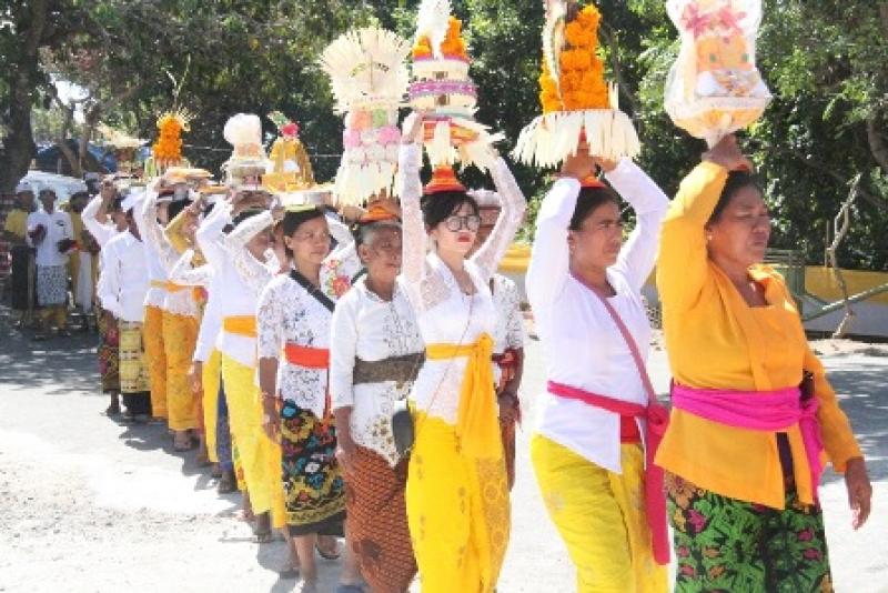 Karya memungkah, tawur, pedudusan agung lan ngenteg linggih berlangsung di Pura Paluang, Banjar Adat Karang Dawa, Desa Bunga Mekar,Nusa Penida Klungkung. Tampak sejumlah ibu-ibu sedang mengikuti salah satu prosesi pada kegiatan dimaksud , Kamis 12/7) kemarin.