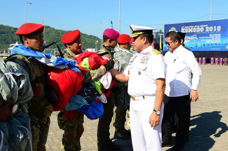 MNEK 2018 -- Kasal Laksamana TNI Ade Supandi, SE., MAP., tampak tengah menyalami para penerjun profesional TNI AL usai membuka secara resmi pelaksanaan kegiatan internasional “3rd MNEK 2018” di Mataram, NTB